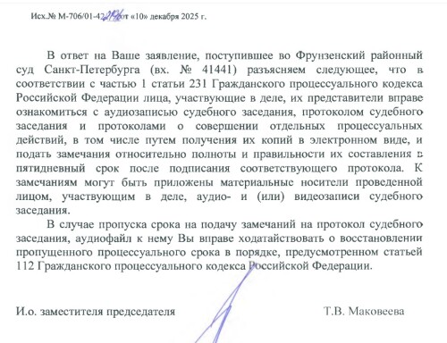 прислали такой ответ: [IMG] [/IMG]звоню в суд неотвечают.ходатайства о высылке аудиопротокола отправил в день судебного заседания(по 2 делам).пришел ответ на непонятно какое мое обращение...по одному делу выслали протокол, а аудио протокола не выслали ни по какому за предыдущее суд.заседание высылали на почту аудиопротокол двд диском хотя я такое же как сейчас подавал ходатайство на высылку аудиопротокола . я не просил их высылать двд диском ,просил выслать мне на госпочту или емайл - тот на который ответы после жалоб приходят. Дозвонился до помощника председателя - она сказала ,что не знает на какое мое обращение дан этот ответ(я много жалоб писал на невысылку протоколов).Но сказала: "Вы можете сделать еще одно обращение приложить копию этого ответа и я вам отвечу" отправил жалобу председателю чтоб написали на что этот ответ и по какому делу(теперь все через макс подписывается) и в ккс питера копию.. |